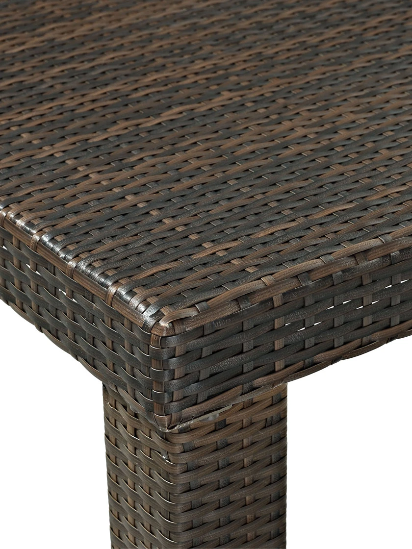 - Table: powder-coated steel with adjustable levelers covered in polyethylene resin wicker