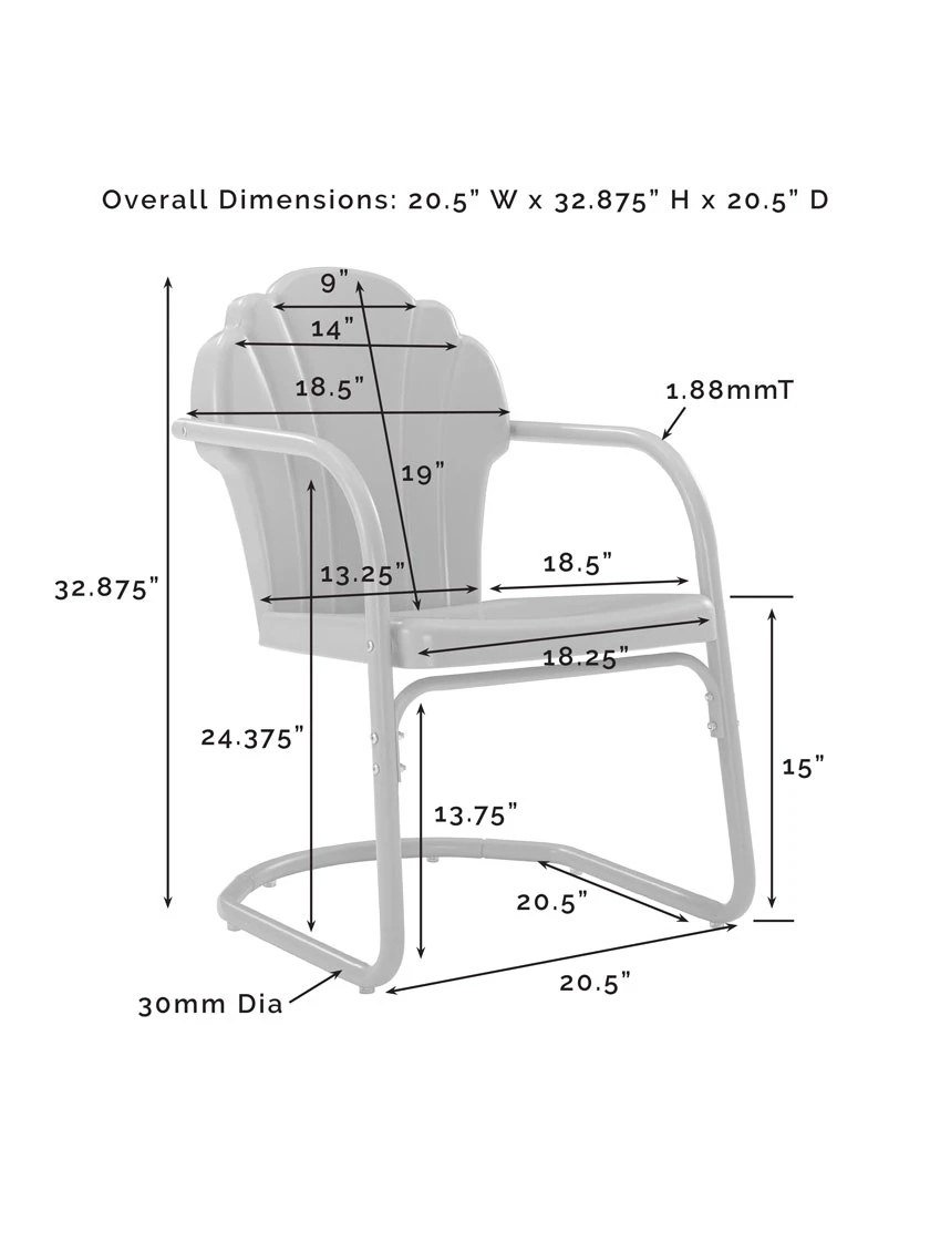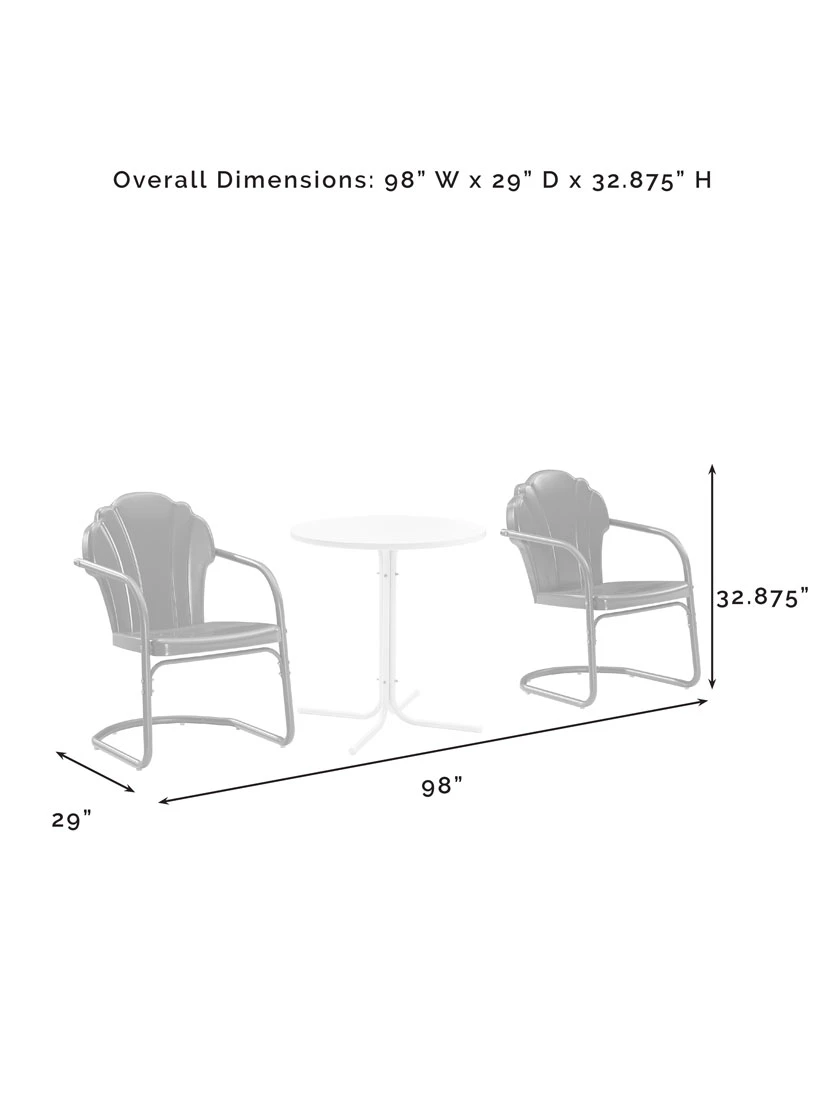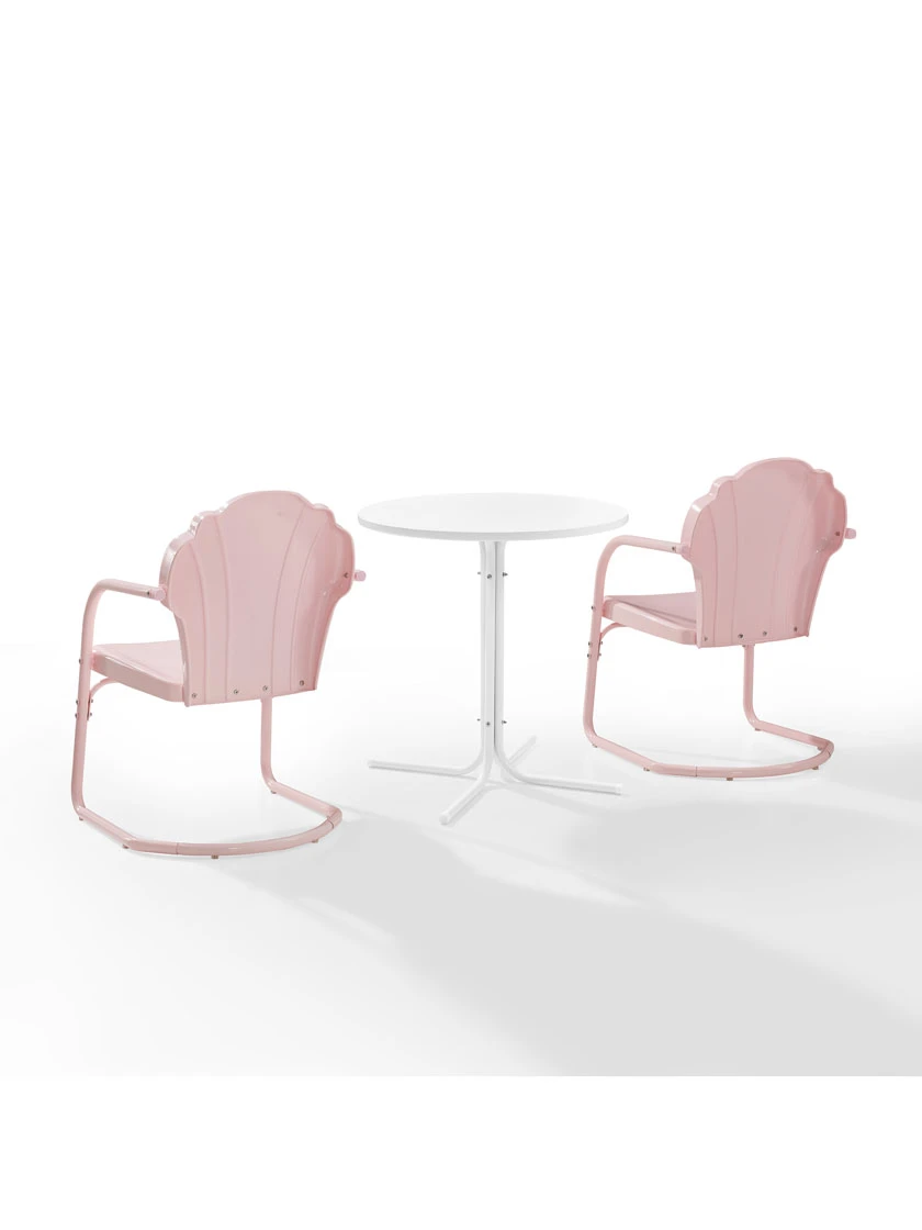 Charming and nostalgic, the Tulip 3pc Bistro Set combines vintage style with classic function. Two scalloped chairs in vibrant colors surround a simple metal bistro table for a fun and functional outdoor lounging experience. The retro silhouette of each chair sits atop a cantilever base that provides just enough flex for lounging in comfort. The table’s sturdy pedestal base is comprised of four metal legs and easily tucks between the chairs, making the Tulip 3pc Bistro Set ideal for a small balcony and patio.